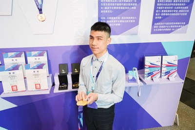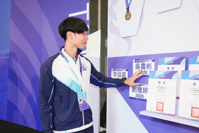視障游泳選手林立翔摸讀獎牌上的點字